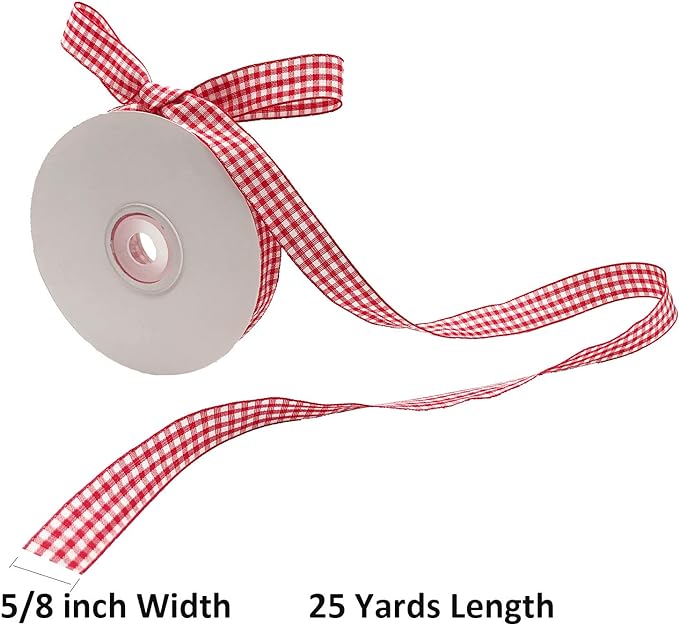 - Size: Our red and white Gingham Ribbon measures 25 yards long and 5/8 inches wide.