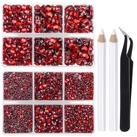 LPBeads 6400 Pieces Hotfix Rhinestones Siam Flat Back 5 Mixed Sizes Crystal Round Glass Gems with Tweezers and Picking Rhinestones Pen